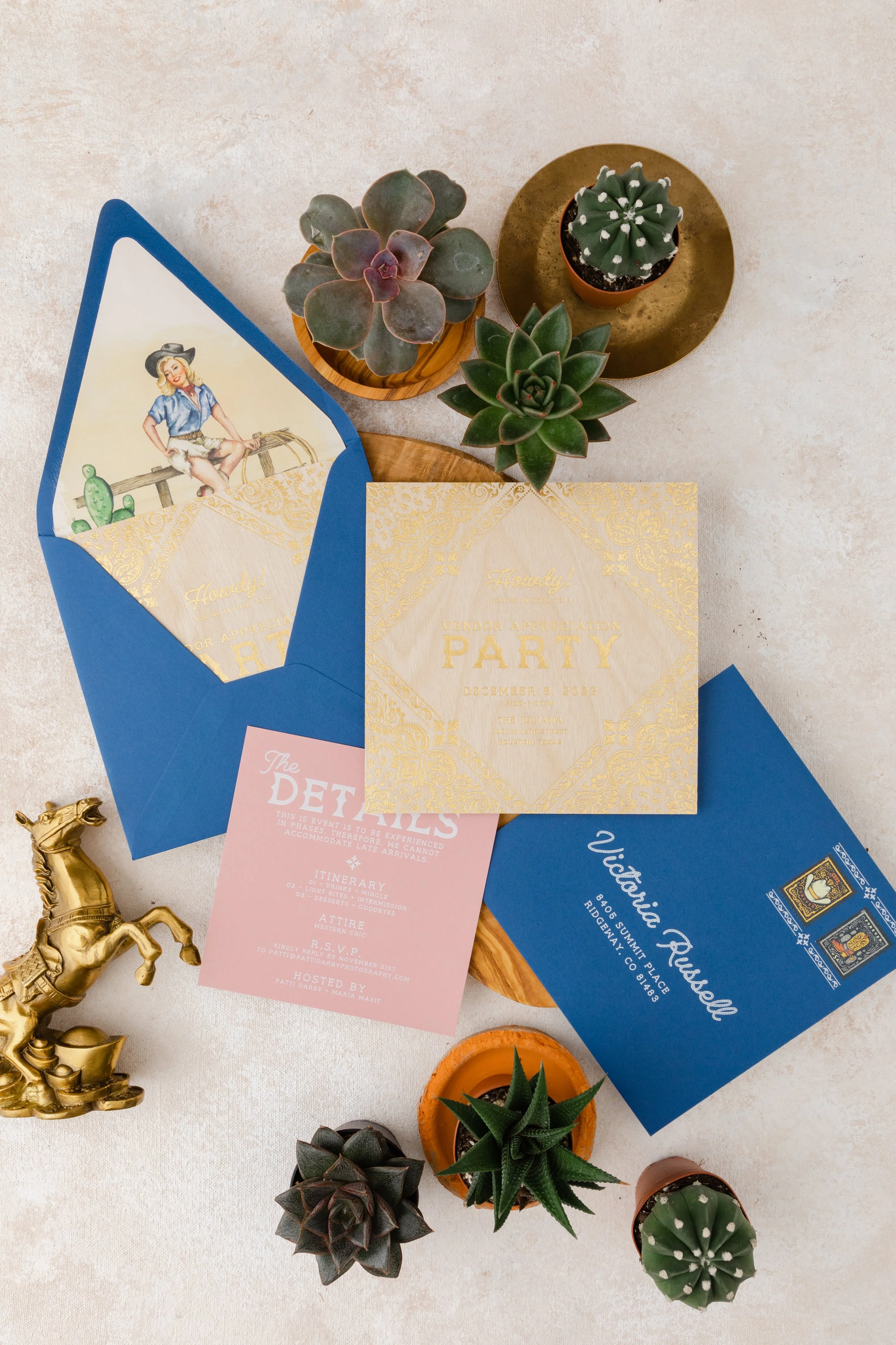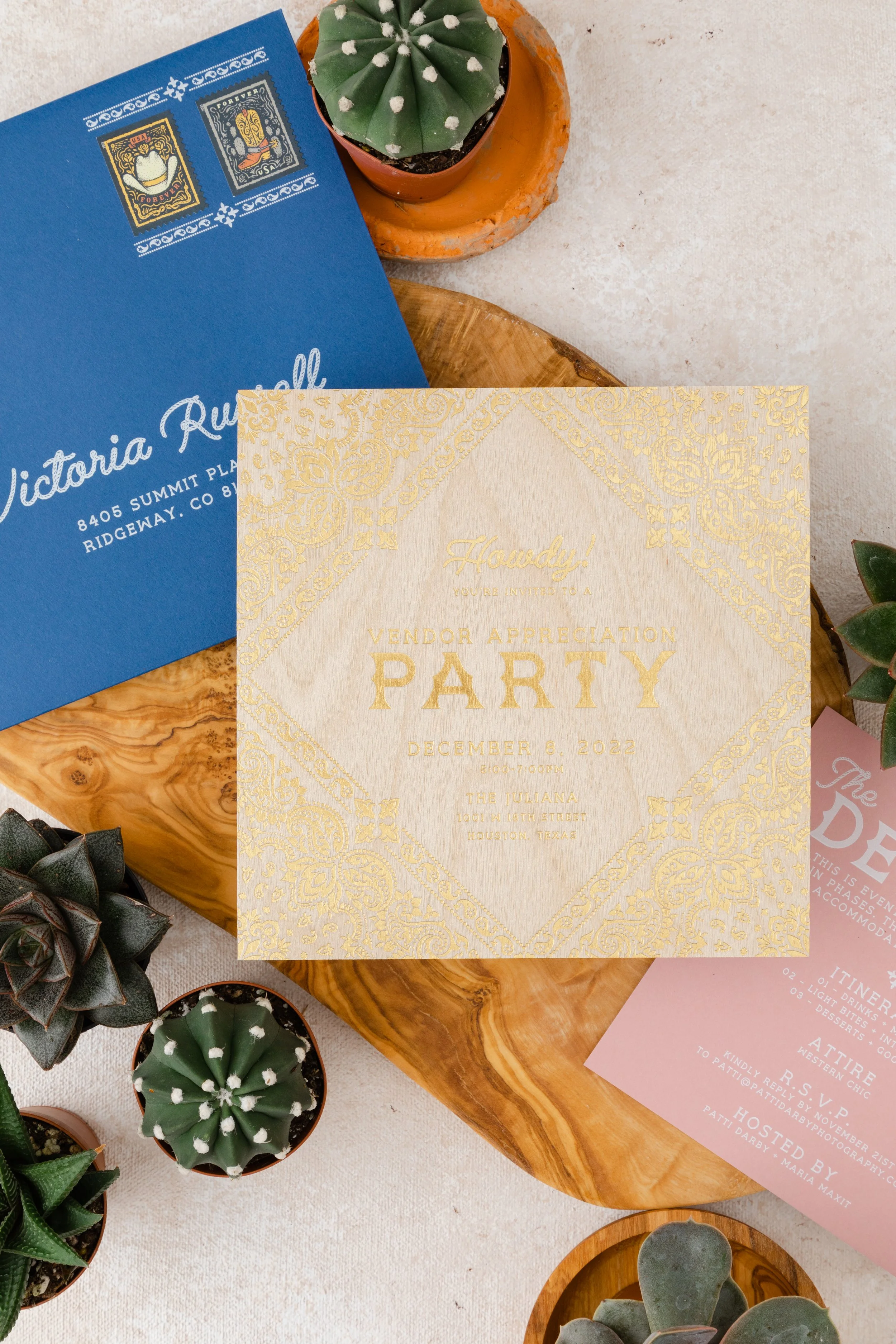 A year end, holiday event with a western theme to thank vendors for a successful year. We created a western theme invitation on real wood with gold foil stamp, envelope liner with iconic western cowgirl, a bar menu on leather mounted to real wood, and custom bandanas as thank you gifts for the attendees.