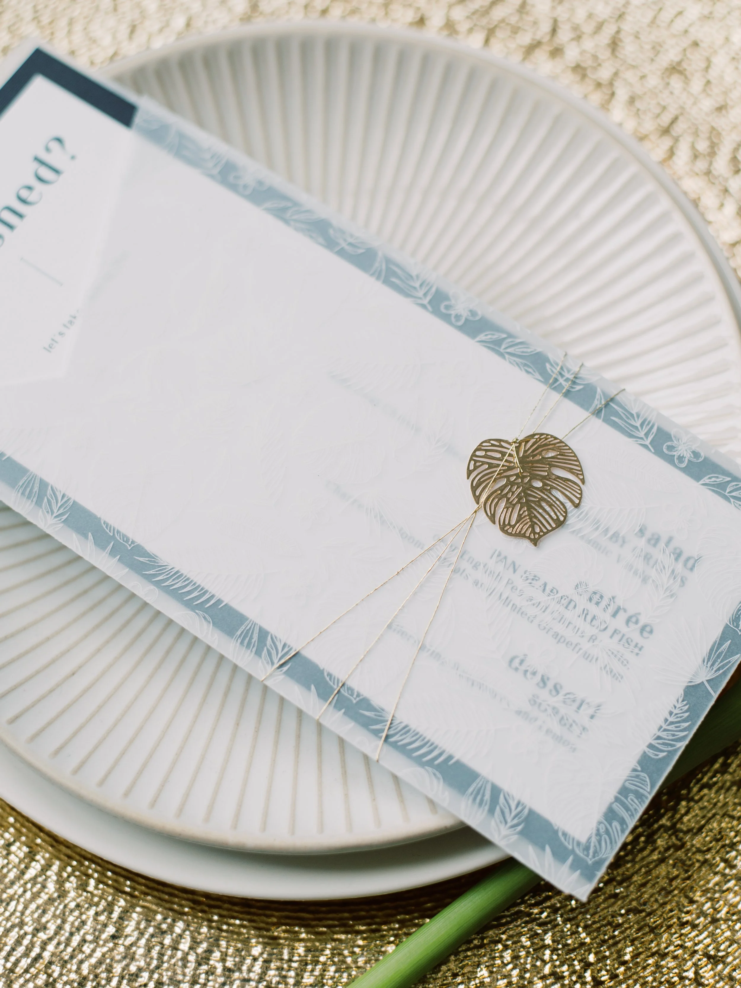 The combined summer meeting for NACE, TXACOM and HSMAI had a summery, tropical theme complete with balloon decor and tropical leaves in shades of green, yellow, black and cream. The menus we created for the meeting were contained in a vellum jacket printed with tropical leaves and showcased a gold monstera leaf. The backside of the menu listed all the event sponsors and QR code for more information.