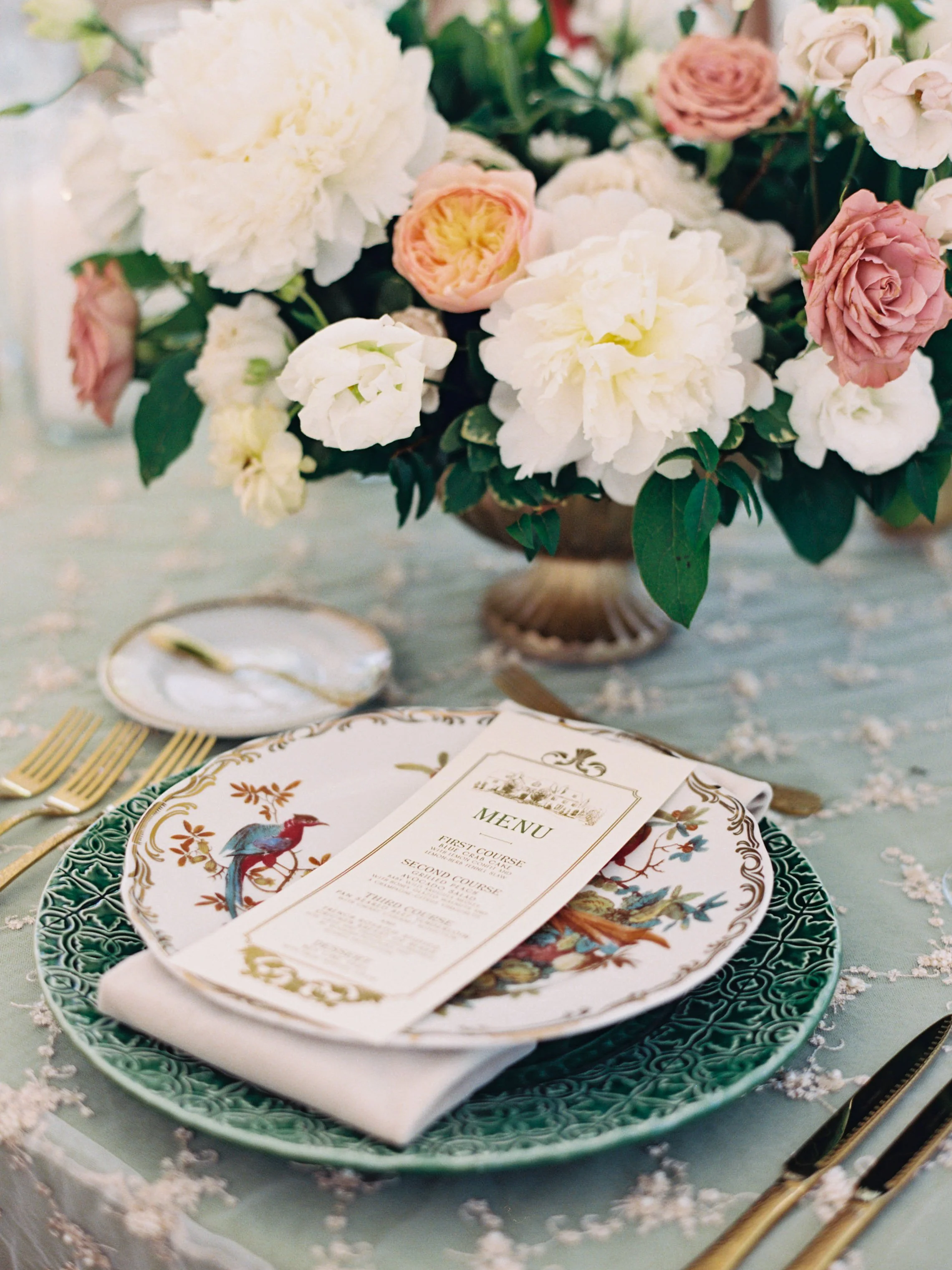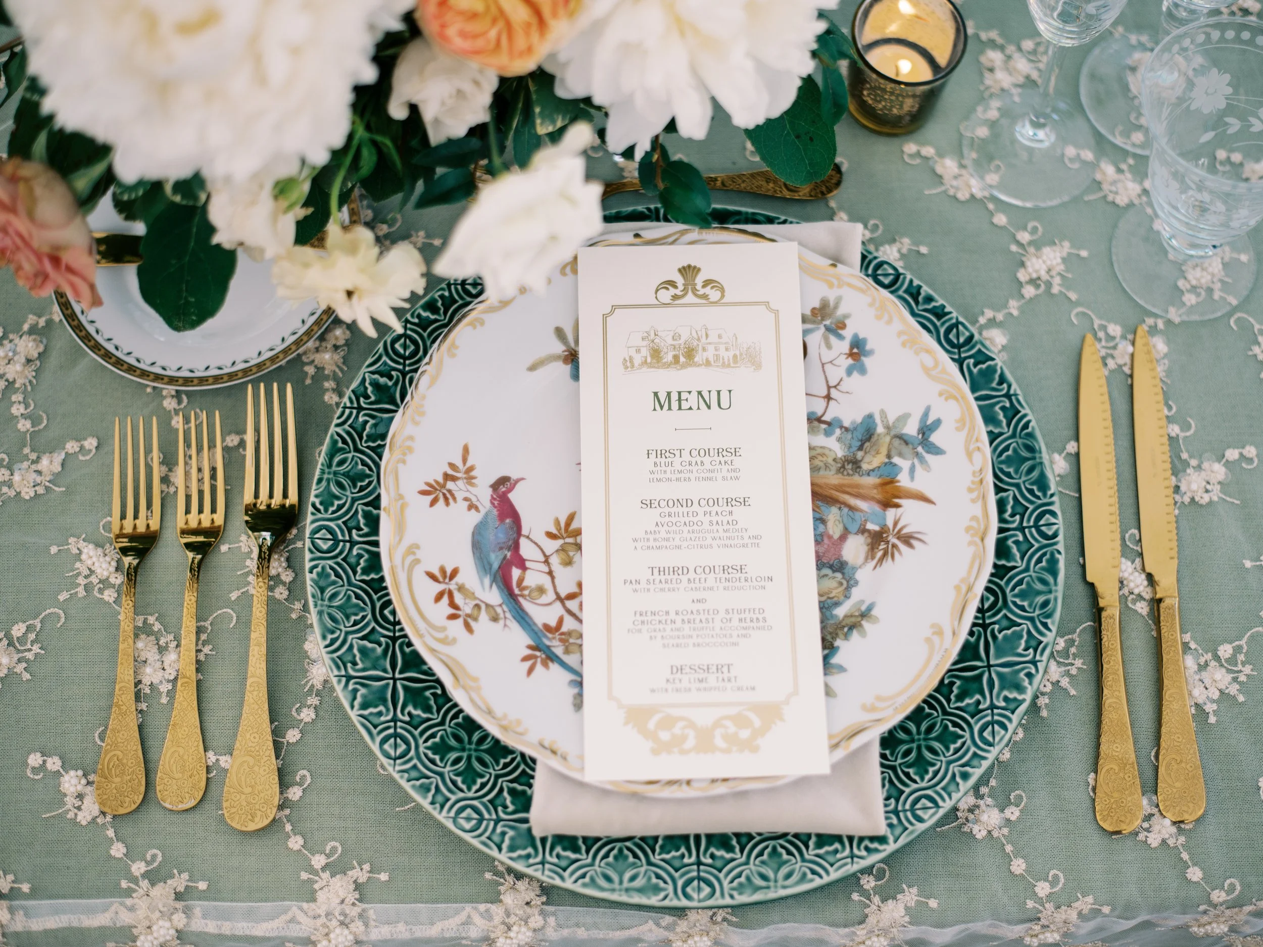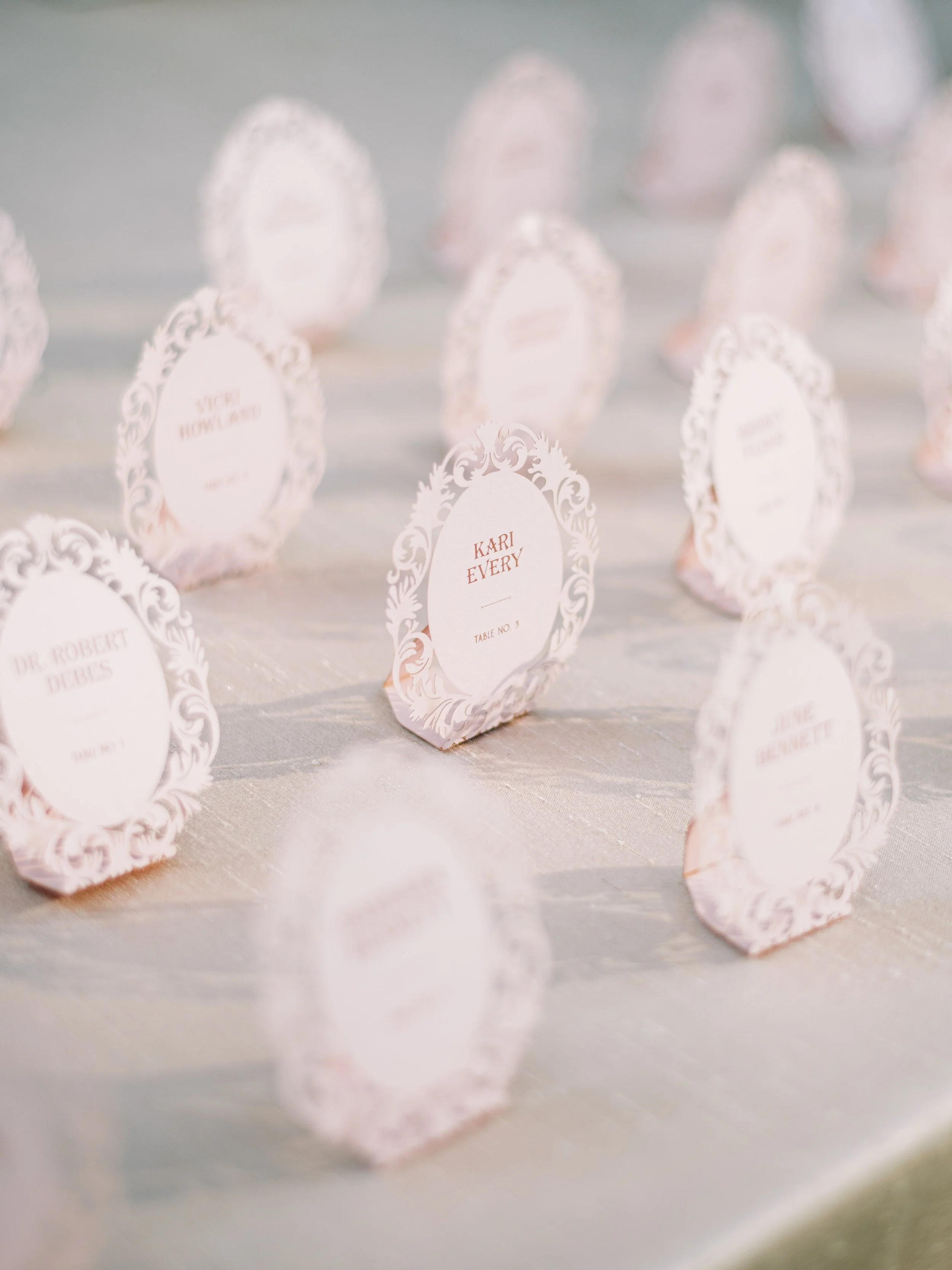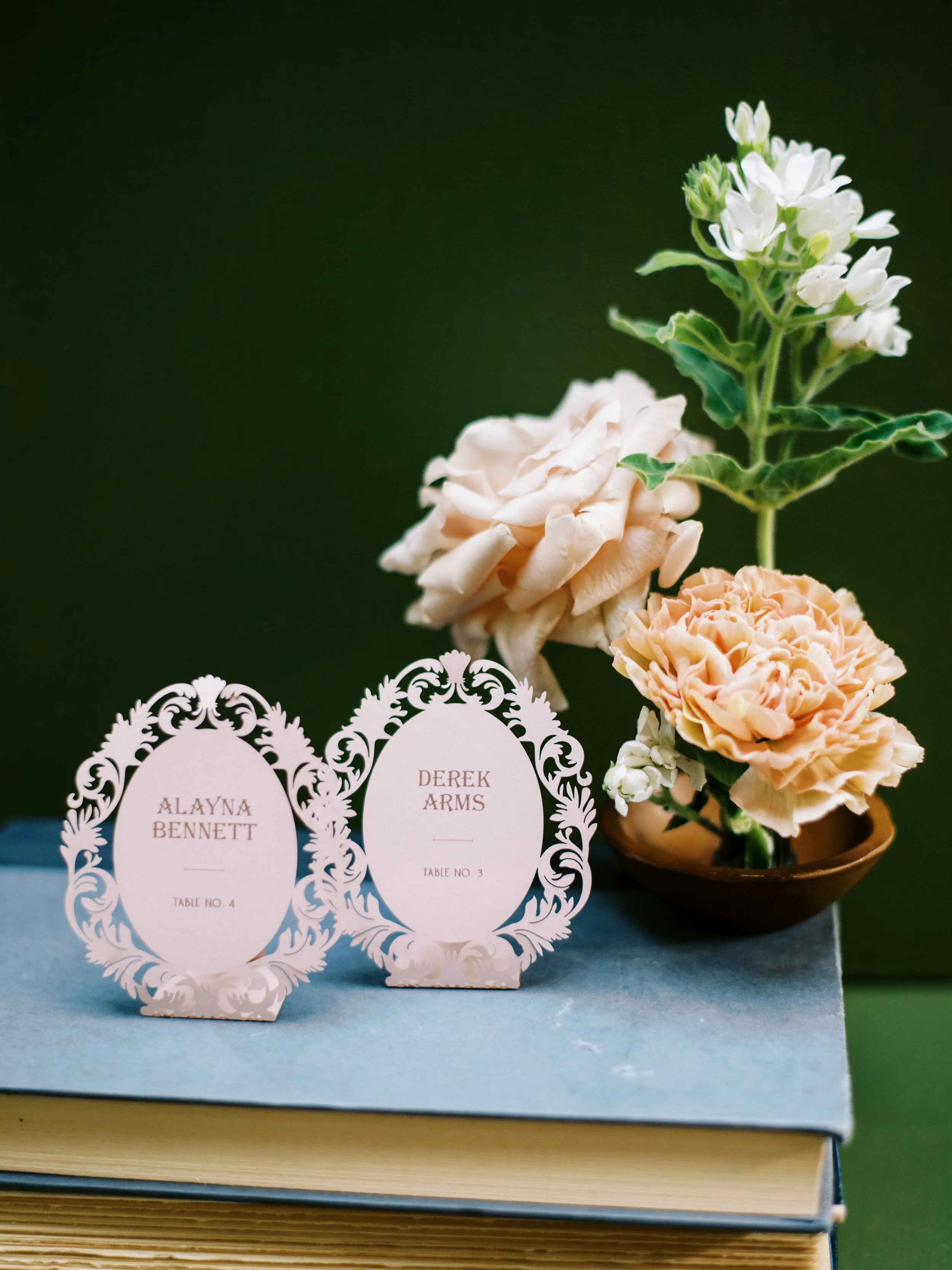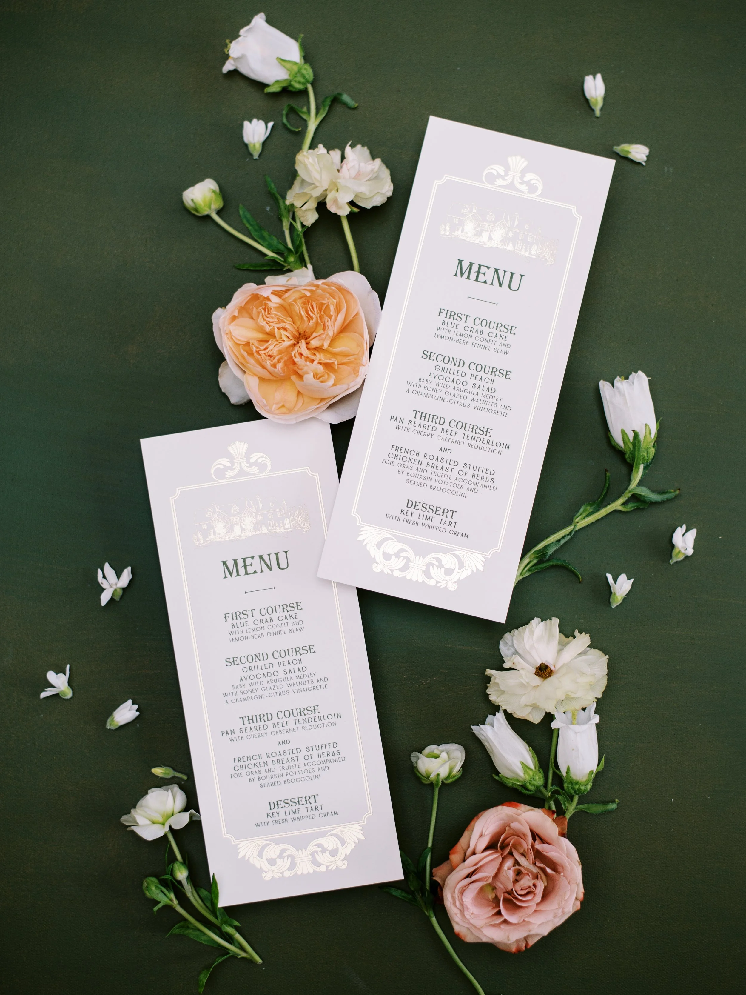 For a fabulous 70th birthday party we created menus and escort cards to coordinate with the Downton Abby theme. The menus featured an illustration of her family home and were letterpress and gold foil stamped.